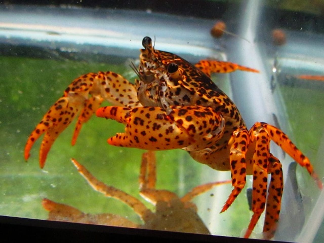 Panther Crabs catch your eye with their bright orange shells, dotted with dark spots that get smaller as they go down to the legs. Their shell, also known as a carapace, shines in any aquarium setting.