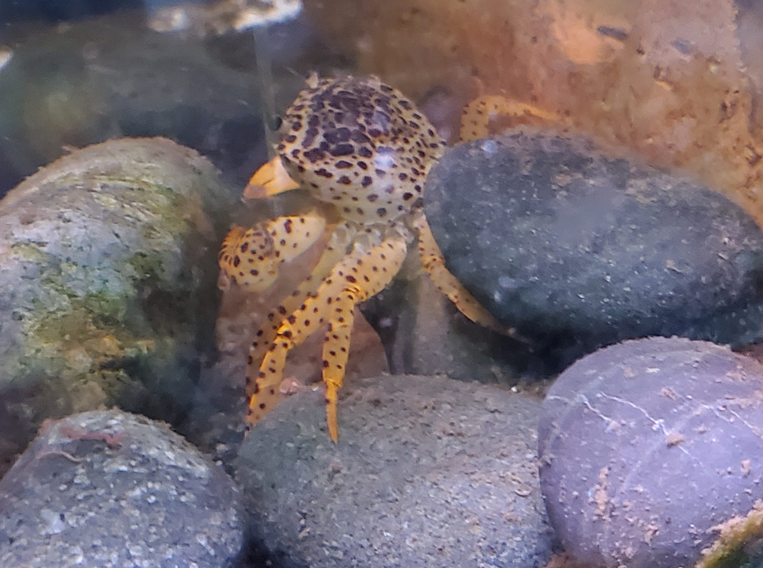 These crabs stand out because of their bright orange color and unique black spots, making them pretty eye-catching in any aquarium setup.