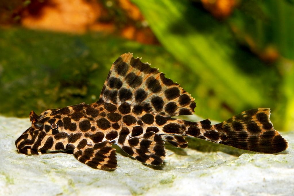The sailfin pleco has a dark brown color with a beige or leopard-like pattern of highly condensed spots that cover its body and finnage. These spots resemble the leopard’s skin, which remains consistent on all areas of the fish’s body. Juvenile sailfin pleco also have the same coloration as adults, with the contrast between the chocolate-black color and the spots depending on the quality of the initial breed.